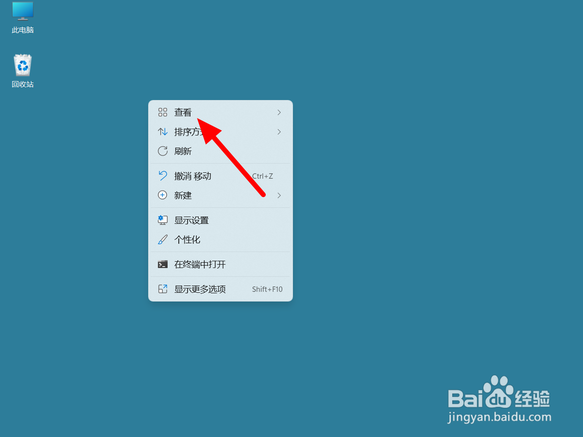 1、在电脑桌面空白位置,鼠标右击,点击查看。