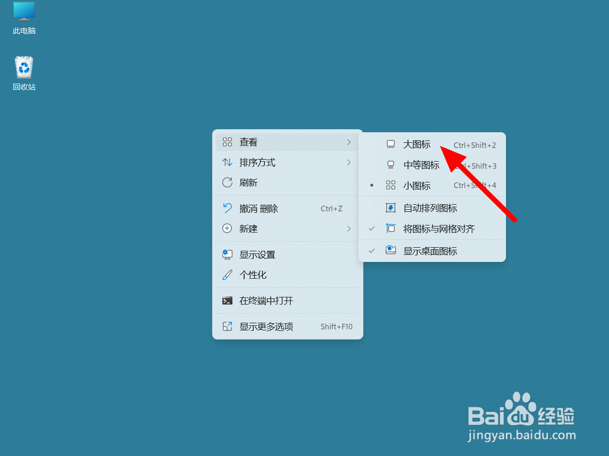 2、在查看选项下,选择图标大小,以大图标为例,点击大图标。