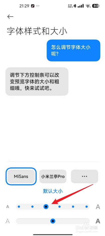 2、进入到字体样式和大小页面,拖动字体滑块进行调整。