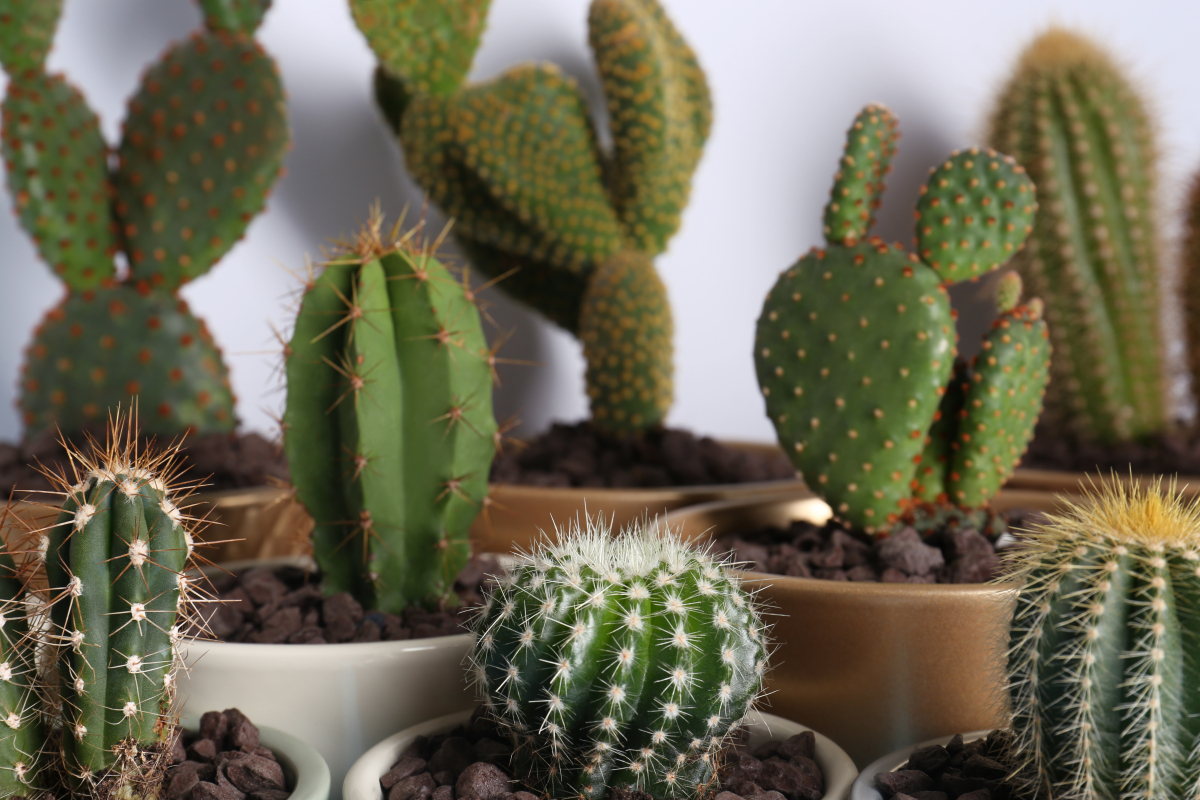 商店水泥地上的花盆里种着各种各样的绿色大仙人掌图片下载